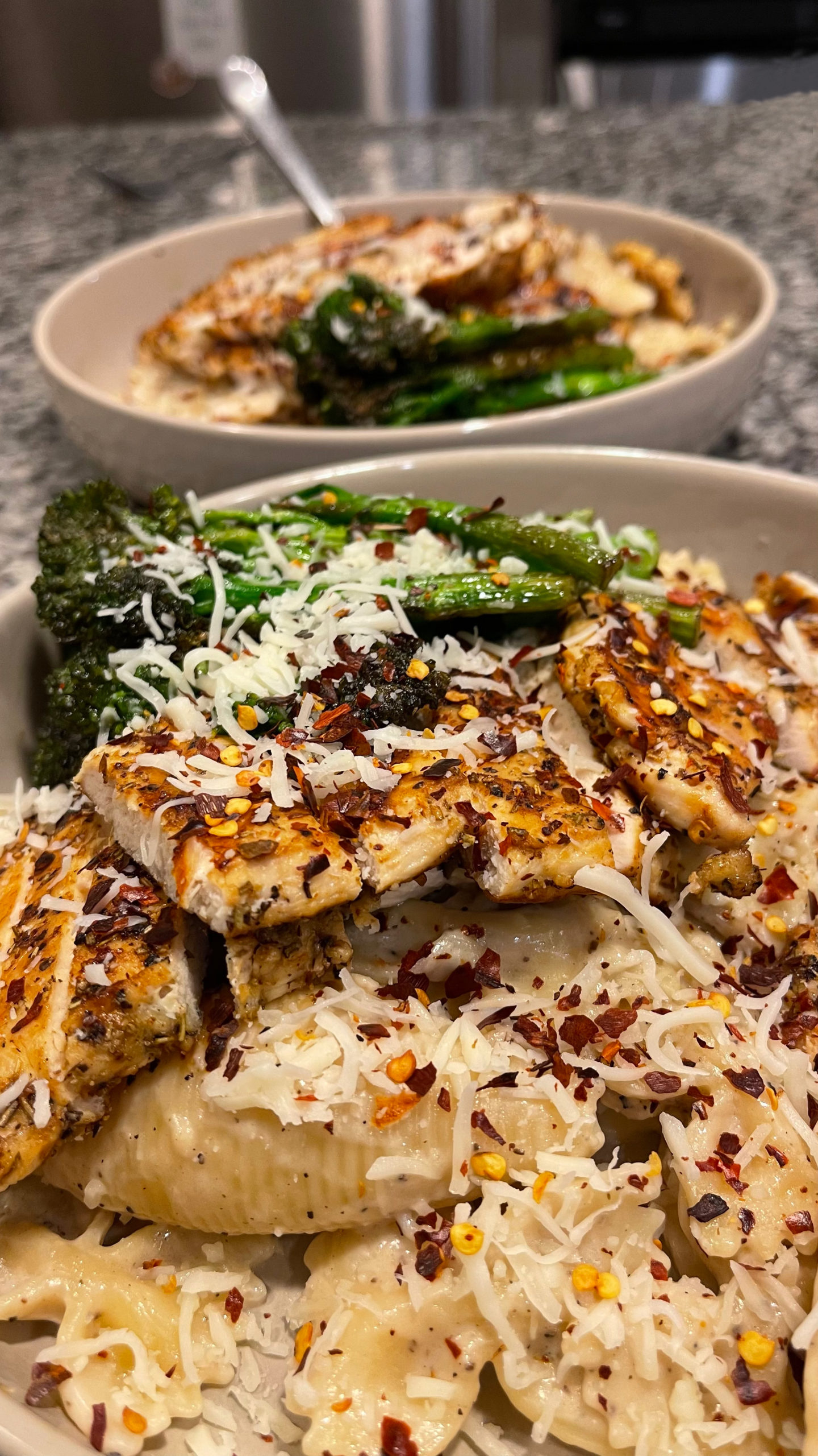 Plate your pasta immediately and top with the sliced or cubed chicken, more pecorino, basil leaves, or red pepper flakes