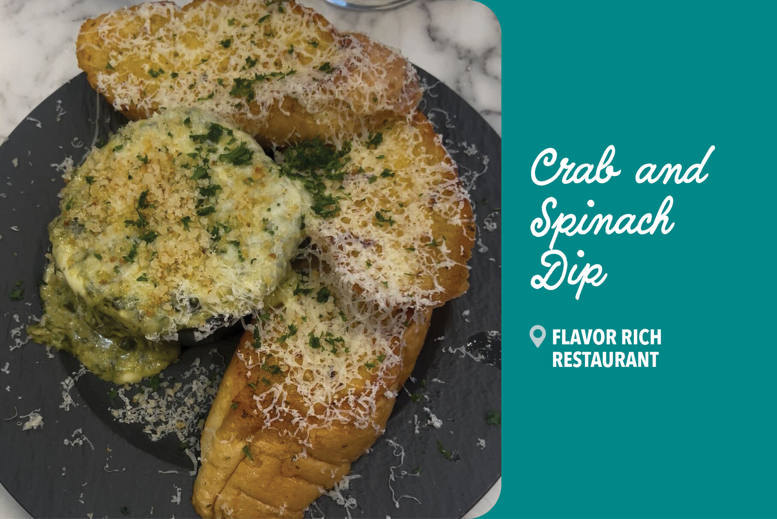 We’ve chosen to highlight the crab and spinach dip from their lunch menu, the perfect appetizer to share with your fellow foodie lovers! This dish features fresh lump crab mixed into a decadent creamy spinach dip that’s topped with Parmesan cheese and toasted bread crumbs. Picture a layer of fluffy, freshly grated cheese placed perfectly on top of the dip. Served on the side is garlic bread that also has a heaping portion of Parmesan cheese. This dish is truly perfection on a plate. It has the perfect amount of richness and creaminess from the spinach dip to eat alongside the toasty garlic bread.